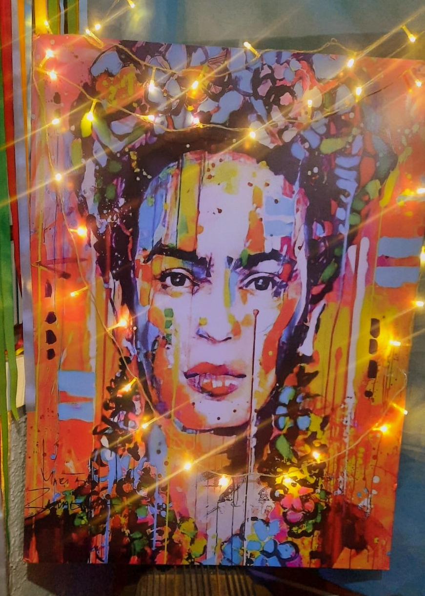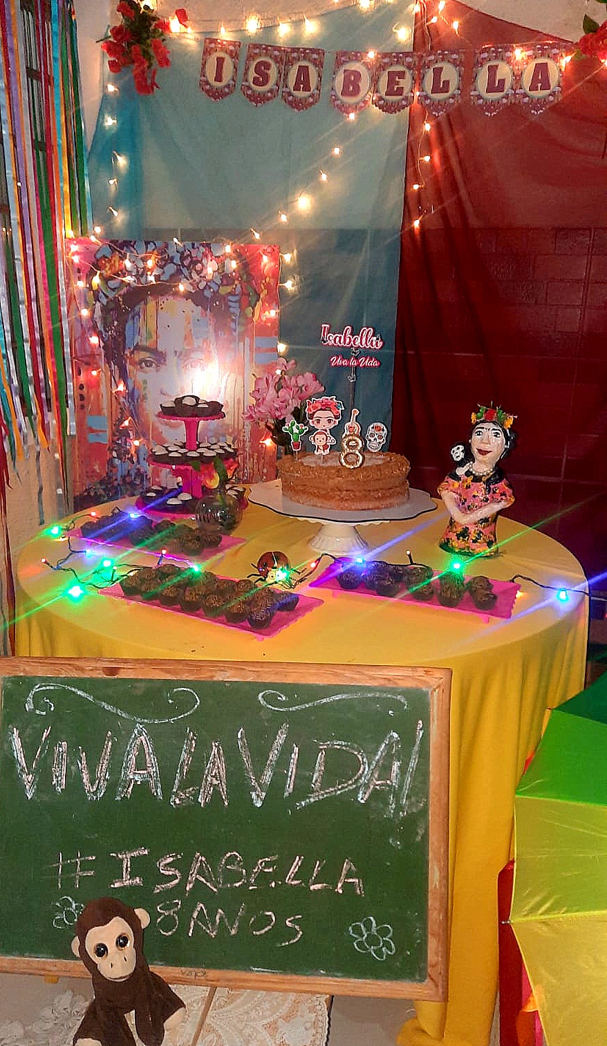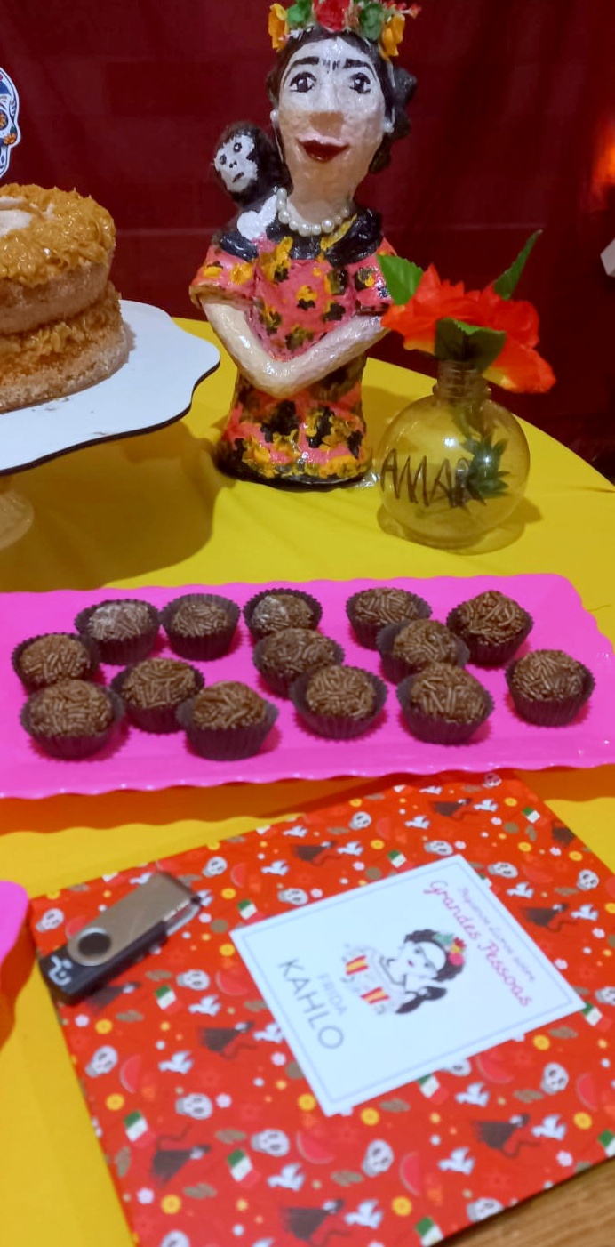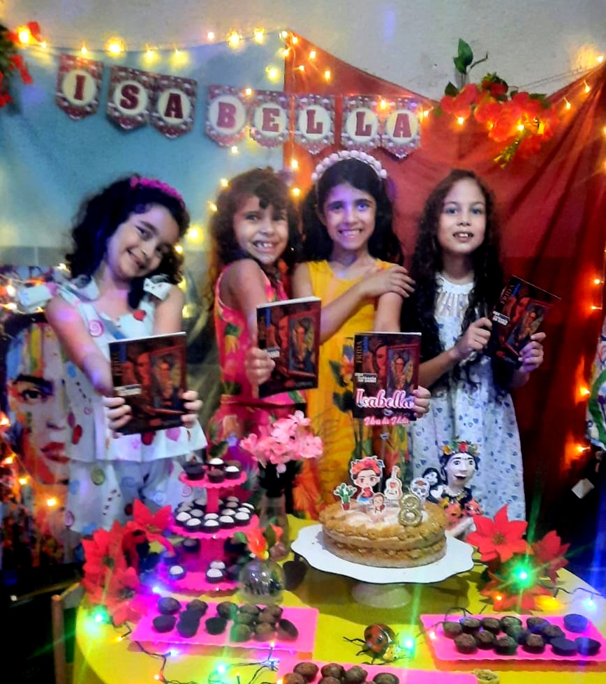 E então, chegou os oito anos da menina. O pensamento dela permaneceu e, com simplicidade, fomos trazendo as referências que ela mesmo ia me falando e inserindo no seu dia especial. Com lençóis, transformamos sua cama casinha, na famosa Casa Azul da Frida Kahlo, com direito a galeria de arte, com algumas telas da pintora. Os cordéis da Tia Edi, também estavam lá em destaque: Frida, uma Infância em Cores. A meninada adorou. A boneca da Frida em machê produzida pela amiga, artista plástica, Denna Sossai , foi sucesso. Também criamos um espaço para as “telas” da aniversariante.