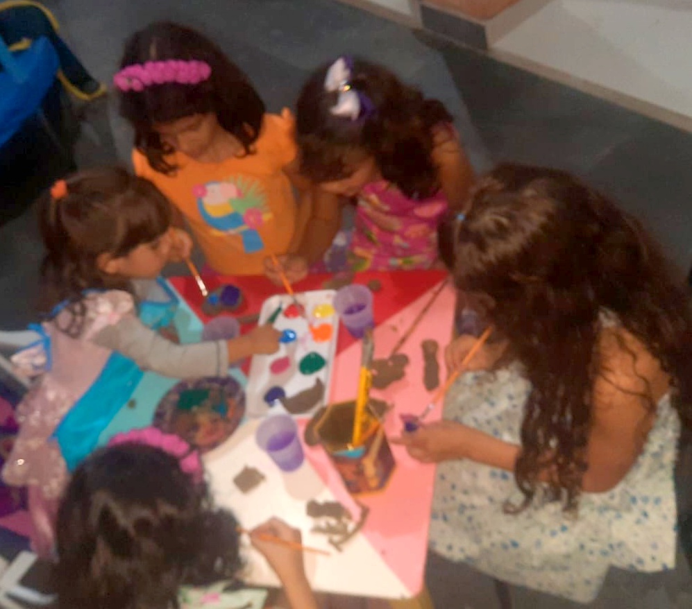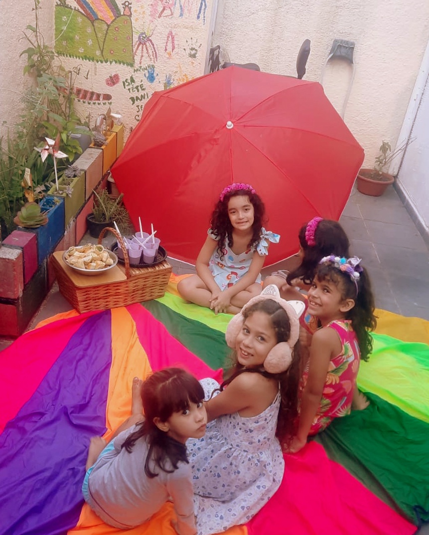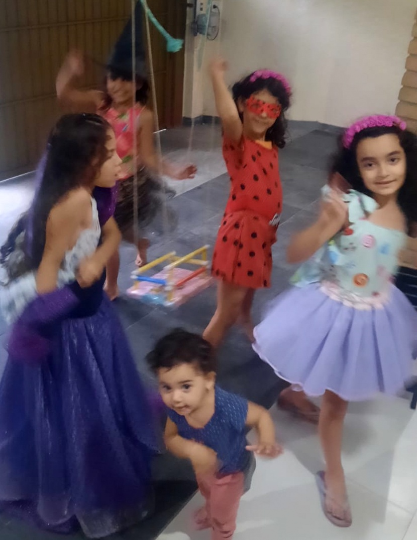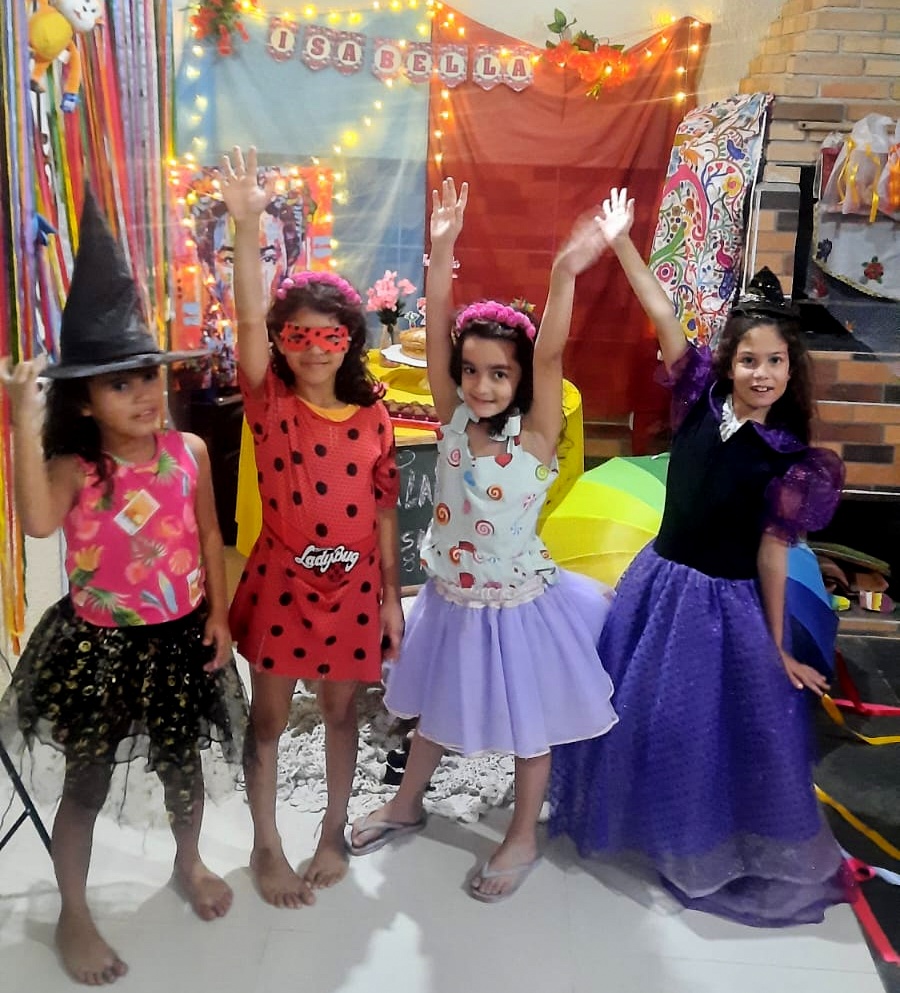 Ainda teve oficina de argila e tiara de flores. Pintura de fridinhas e caveirinhas, impressas pela amiga e vizinha, tia Lêda. Num piquenique gostoso no quintal, lanchinhos, cantorias, danças (sem Tik Tok) e desfile de fantasias diretamente do baú encantado, com princesas, bruxa, ladybug. Brincaram de casinha, na casa azul e depois, na pequena varanda do sobrado, com direito a parabéns com as bonecas. Da esquina era possível ouvir a empolgação dessas meninas! E as brincadeiras de rua não puderam faltar. As preferidas desta idade: pega-pega, esconde-esconde, amarelinha e muitas pedaladas de bicicleta. A gritaria da mais pura felicidade foi grande. Foi tanta coisa, que, em muitos momentos, a fotografia foi deixada de lado porque, viver tudo isso, era realmente o que mais importava. Uma tarde colorida, divertida, cheia de amorosidade, com aquelas que dividem diariamente com Isabella, sentimentos puros e genuínos que só essa fase é capaz de despertar.
